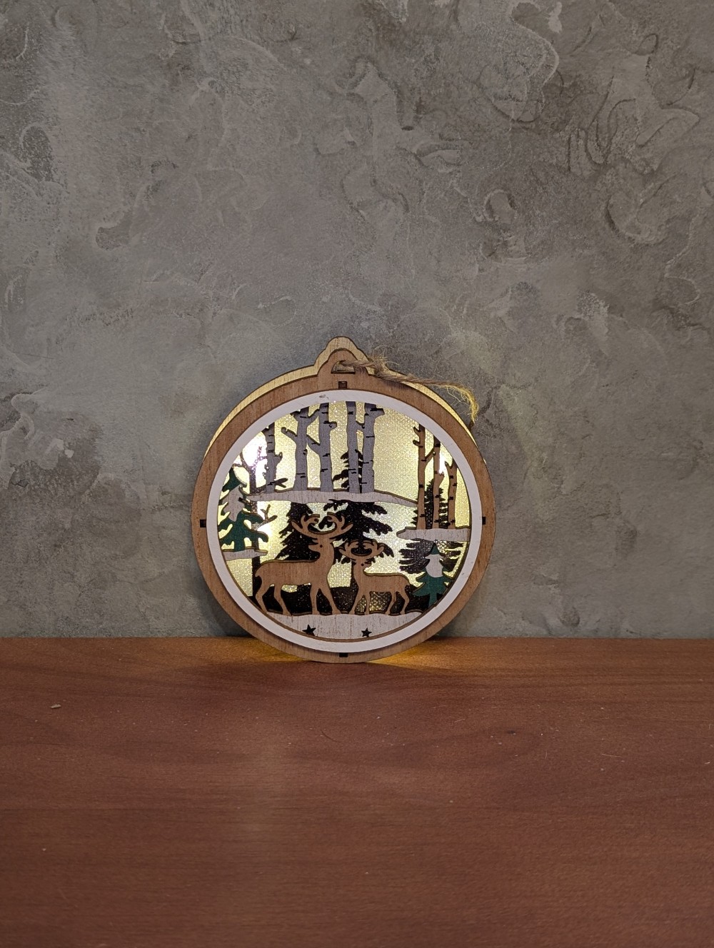 Home / Christmas / Light Up Round Wood Ornament Deer in Forest
