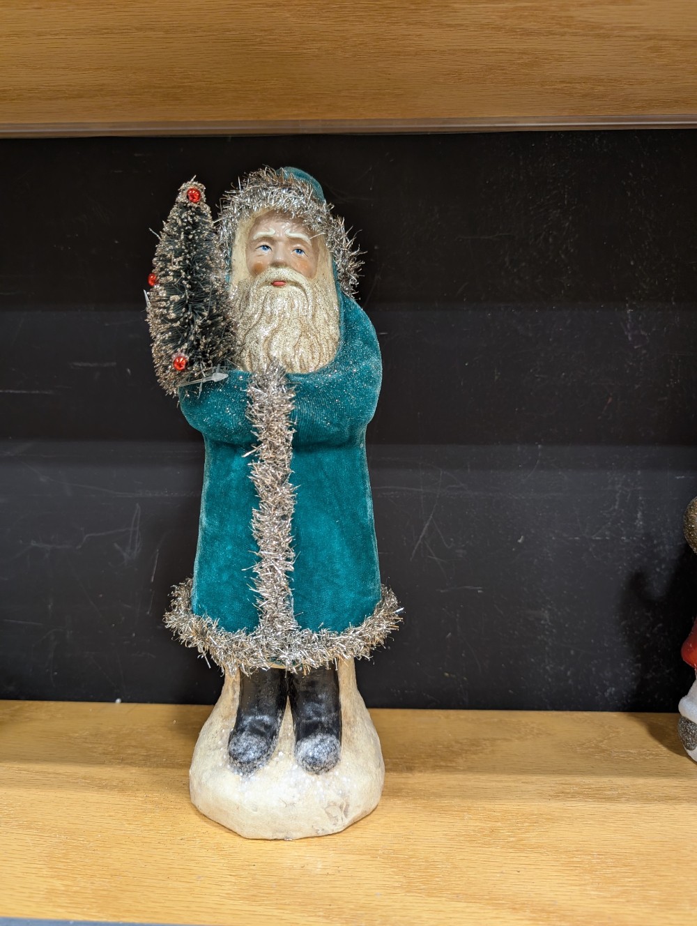 With a velvet robe adorned with tinsel trimming and glitter, and Santa holding a festive tree