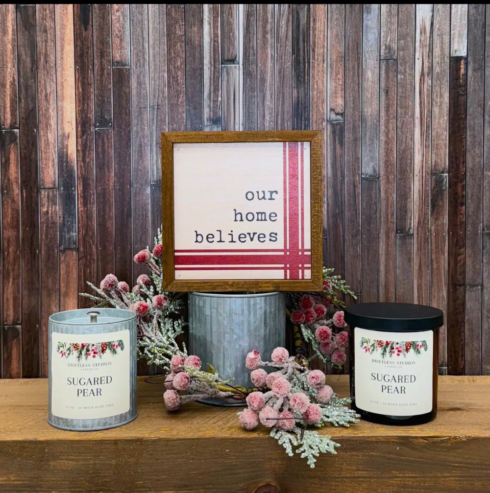 The Sugared Pear candle, with its luscious blend of green pear, apple, sweet orange, cinnamon, magnolia, vanilla, nutmeg, sugar, and spice, infuses your space with the warm, festive glow of a winter orchard.