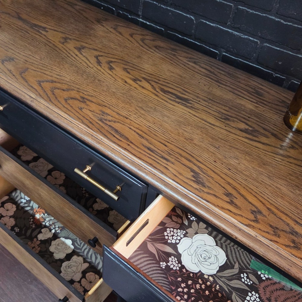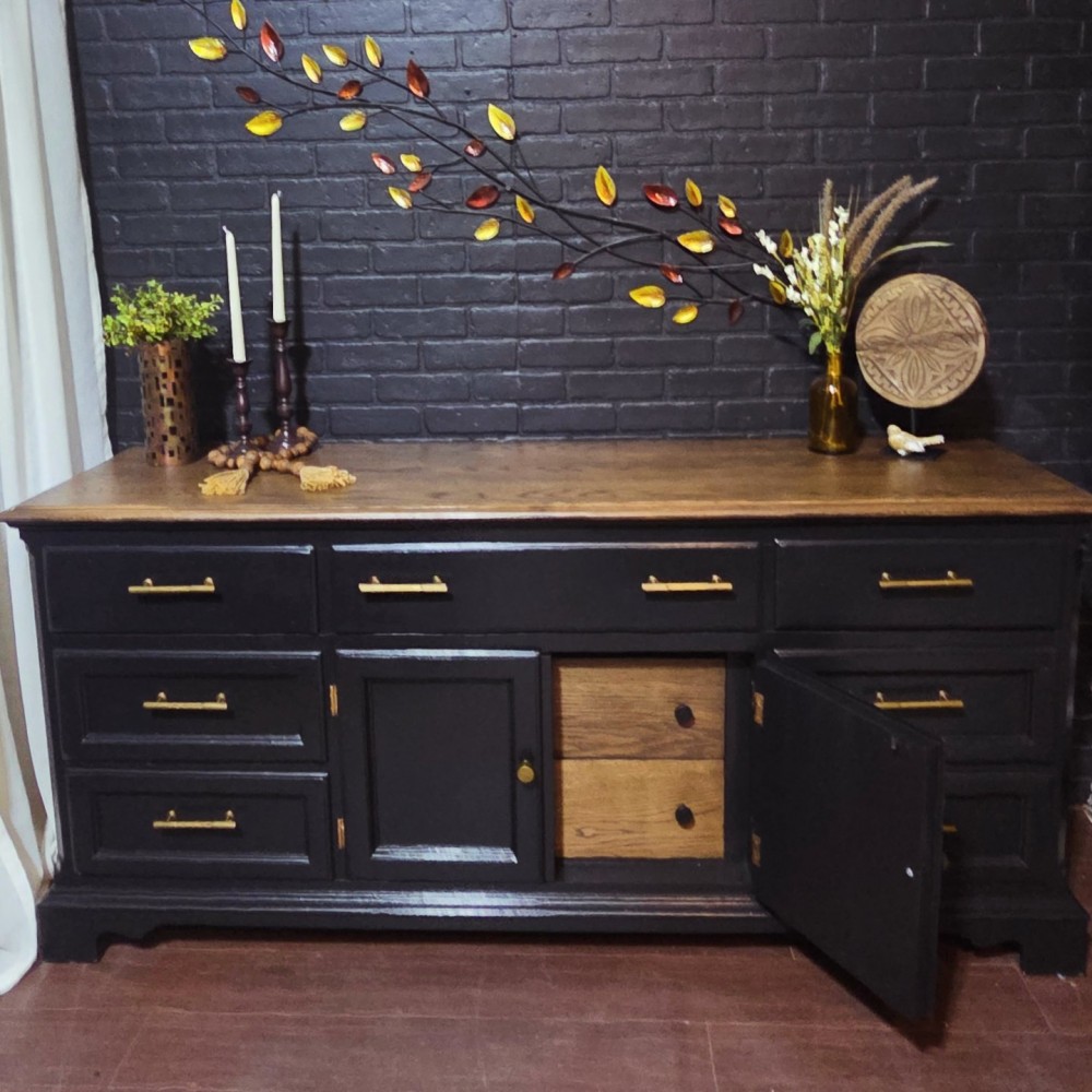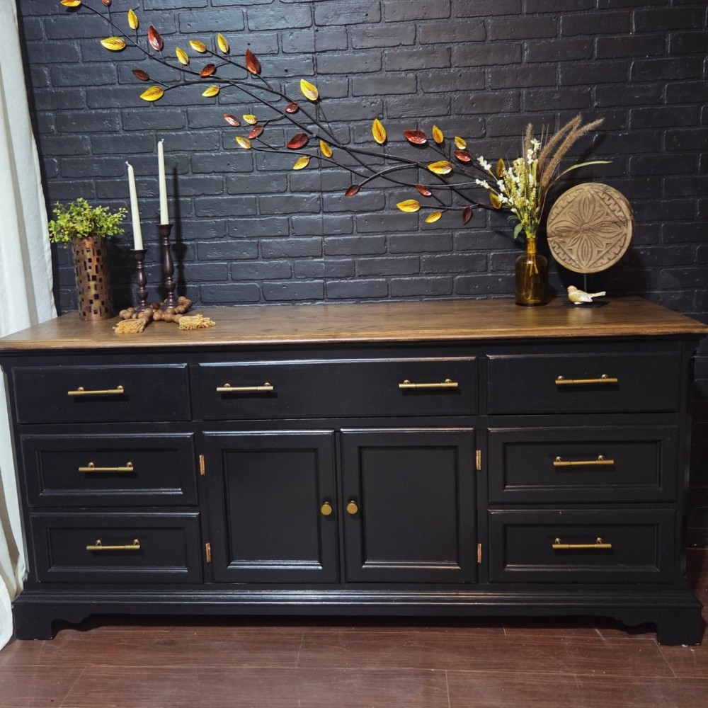Top and inside drawers completely sanded and stained in kona. Rest painted in melange one New York Black. Sealed 3x in satin poly for durability and protection. All drawers in excellent working condition and fully lined. New hardware.