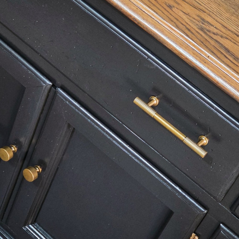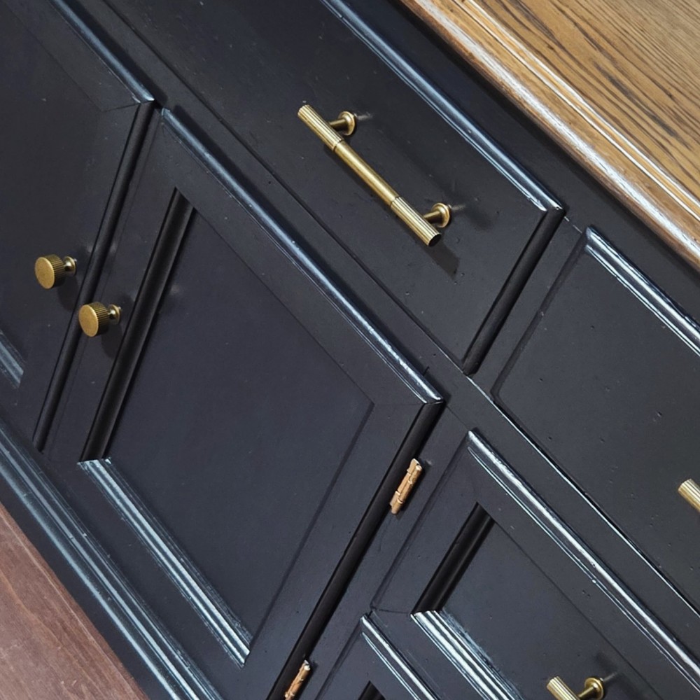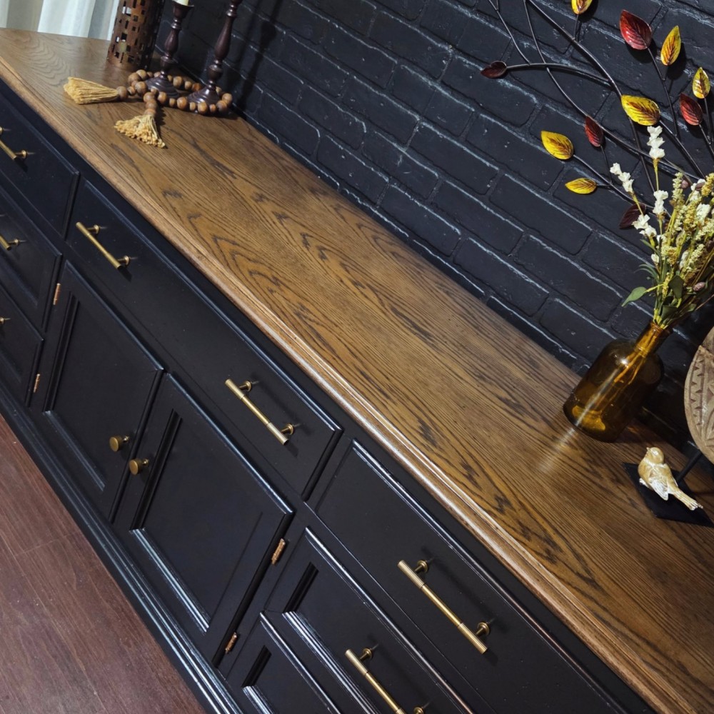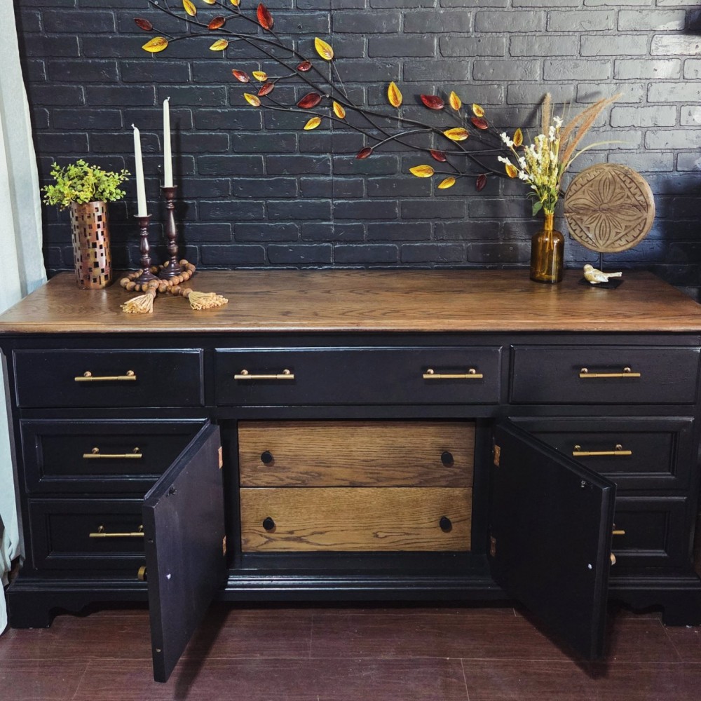 Top and inside drawers completely sanded and stained in kona. Rest painted in melange one New York Black. Sealed 3x in satin poly for durability and protection. All drawers in excellent working condition and fully lined. New hardware.