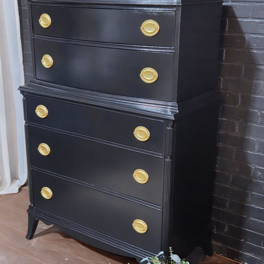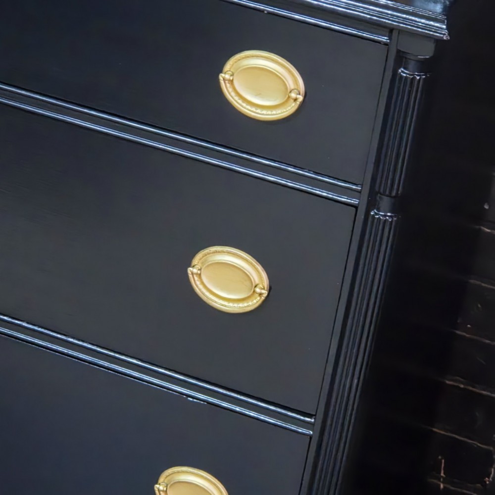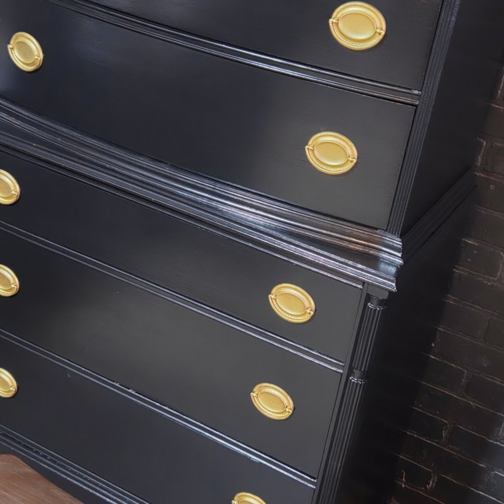 Painted in fusionmineralpaint coal black. Sealed 3x in satin poly for durability and protection. All drawers in excellent working condition and fully lined. Hardware cleaned and polished.