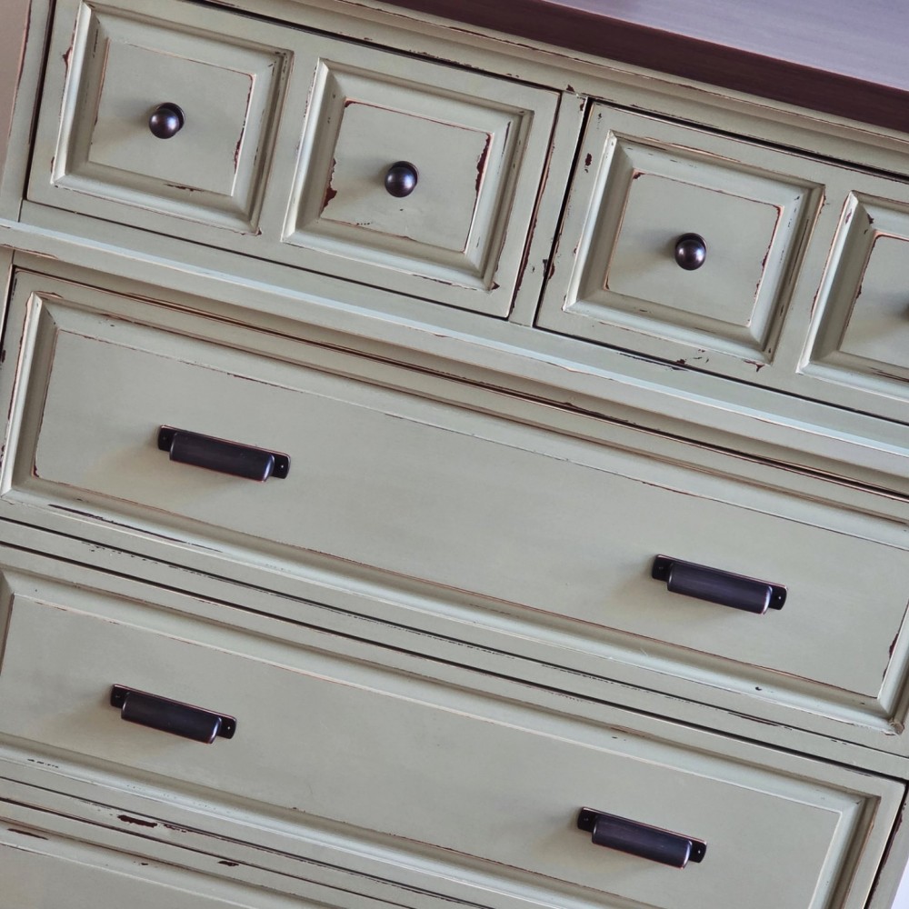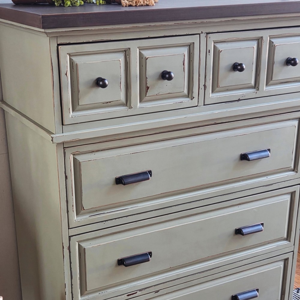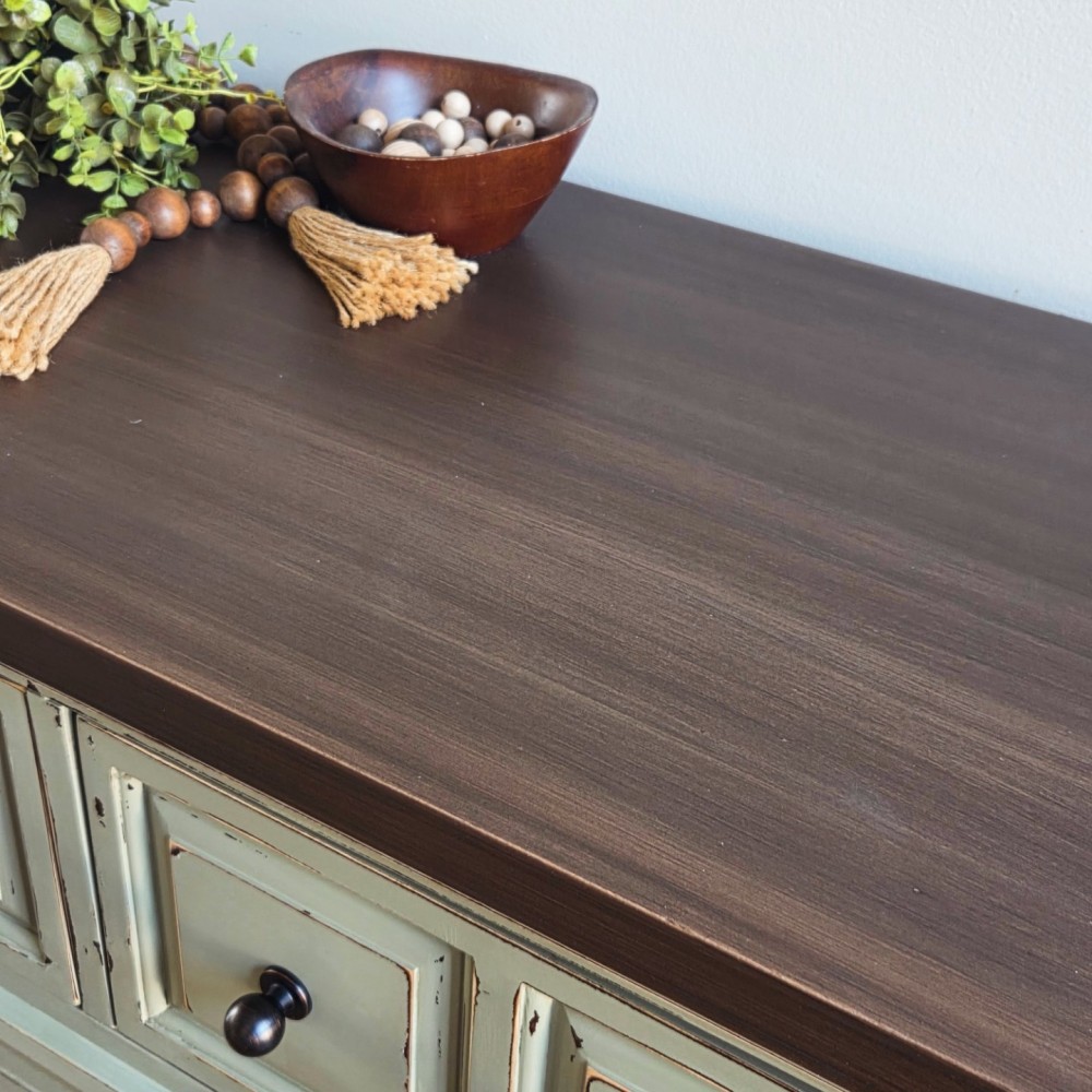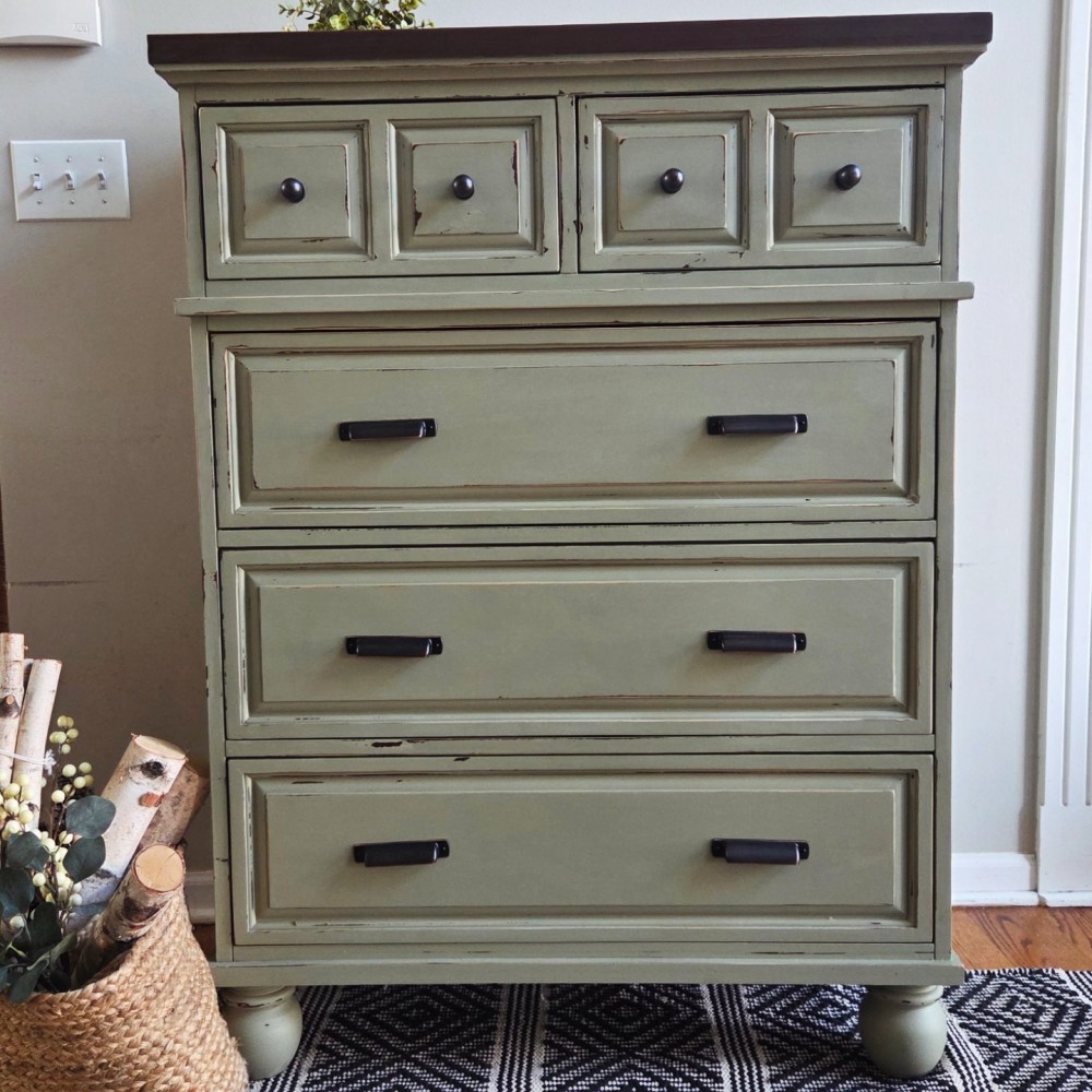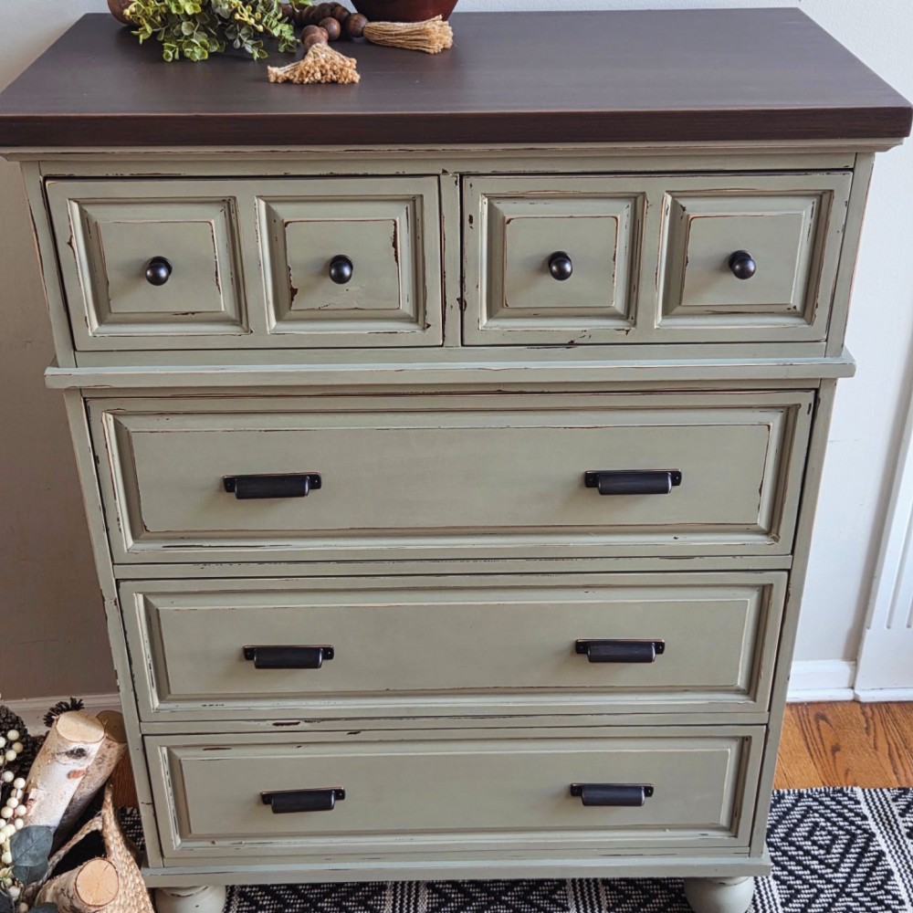 Sturdy dresser painted in fusionmineralpaint lichen. Slightly distressed and sealed in clear wax. Top done in retiqueit liquid wood primer + kina stain. Sealed 3x in satin poly.