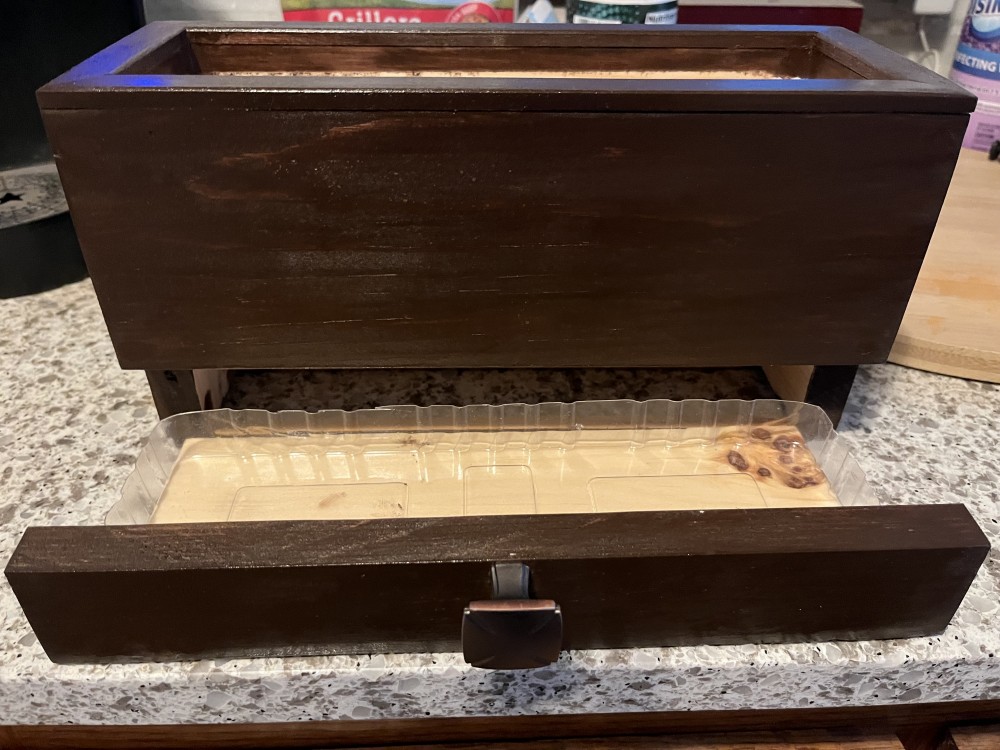 Small walnut stained indoor herb garden planter box, includes plastic trays and 3 packs of herb seeds