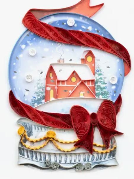 The handcrafted snowglobe card will delight your inner child! Take a peek and you can see the snow falling onto the water color painted house making for a perfect holiday scene.