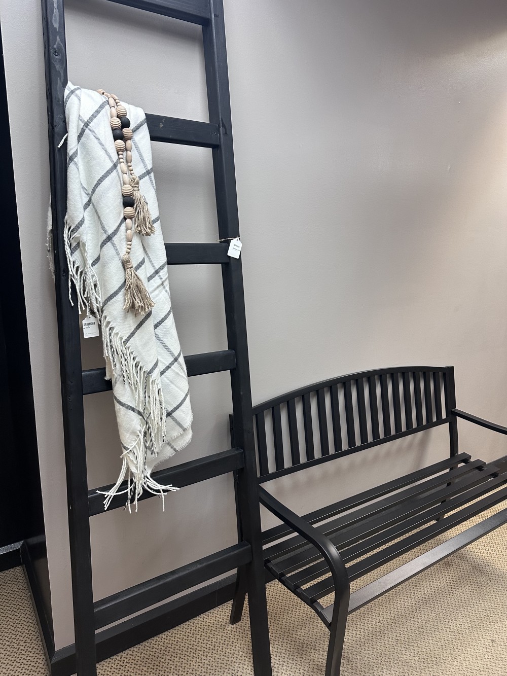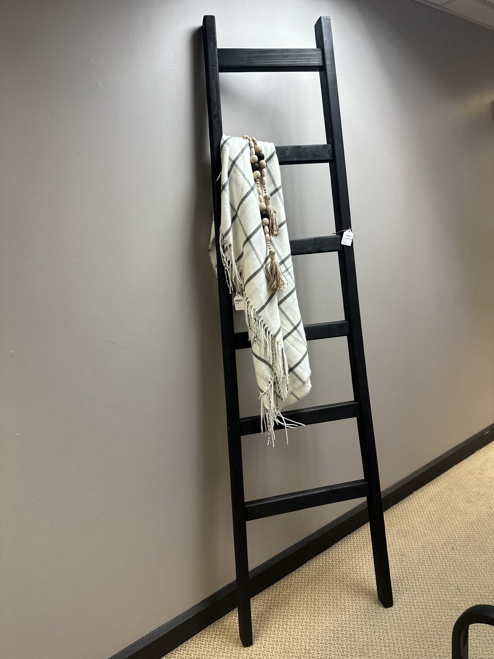 This handcrafted ladder is the perfect way to add height to a corner of your room and to display your favorite blankets, wreaths, baskets, stockings, etc. This one was stained in black and varnished for extra protection. The dimensions are 24 X 2.25 X 84.