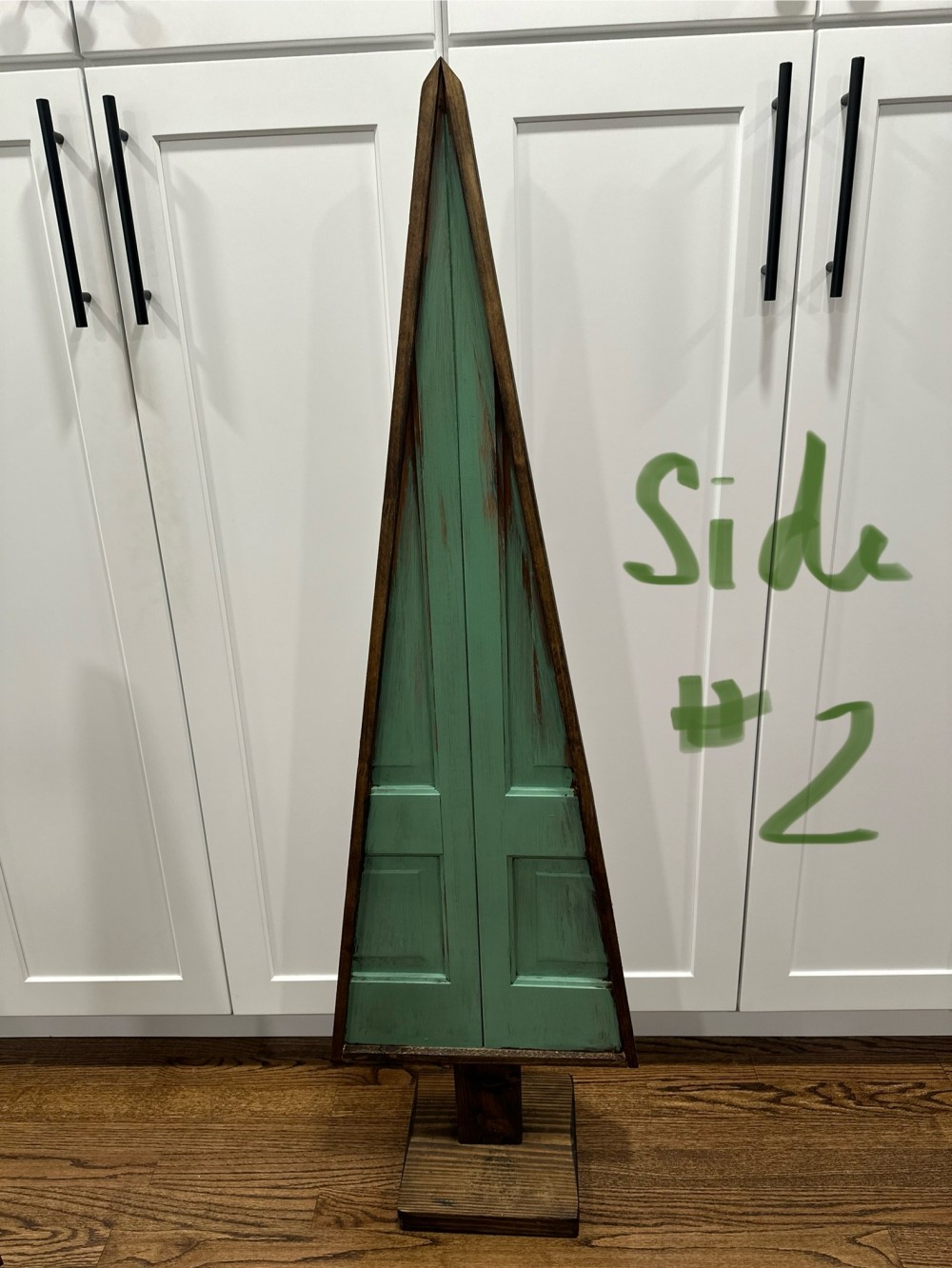 This tree is made from a repurposed door. We trimmed it out and painted both sides in different colors to give you options and to display in a spot in your home that can be seen from both sides. There is a hook on the white side. We are including a small wreath, but you can trade it out for something else if you prefer. This tree reaches 52 inches in height.