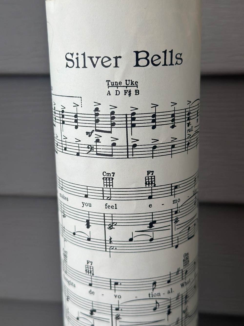 Wood candleholder is filled with a wonderful Vintage Music Score "Silver Bells" acting a the "candle" set in a greenery candle-ring with pinecones and all is brought together with a coordinating removable bow. A unique, one-of-a-kind creation!