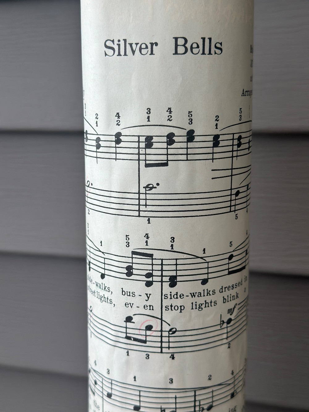 Wood candleholder is filled with a wonderful Vintage Music Score "Silver Bells" acting a the "candle" set in a greenery candle-ring with pinecones + red berries, and all is brought together with a festive removable bow. A unique, one-of-a-kind creation!