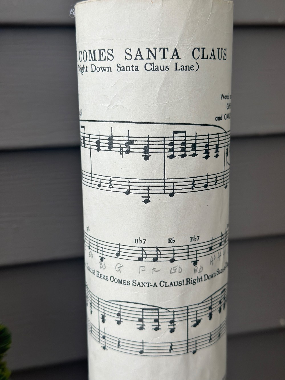 Wood candleholder is filled with a wonderful Vintage Music Score "Here Comes Santa Claus" acting a the "candle" set in a greenery candle-ring, with pinecones + red berries, and all is brought together with a festive removable bow. A unique, one-of-a-kind creation!