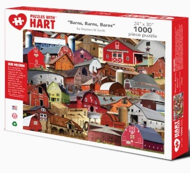 Throughout history the modern barn largely developed from the three aisled medieval barn, commonly known as tithe barn or monastic barn. Today’s modern barns are more typically steel buildings. From about 1900 to 1940, many large dairy barns were built in northern USA with gambrel or hip roofs. As you travel across the USA you can see the New England barn, prairie barns, round barns, new world Dutch barns, cantilever barns, even the simple pole barn. All dotted throughout our agricultural landscape in this 24"x 30" 1000 piece puzzle.