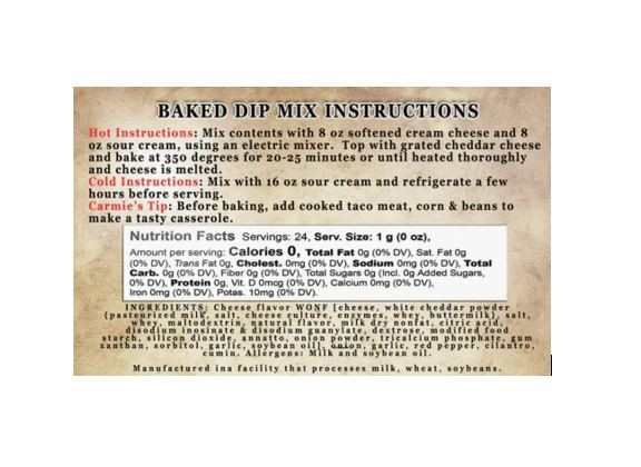 This versatile dip can be served hot or cold, and tastes just like a cheese enchilada! Add sour cream or a mixture of sour cream and mayo to create 2 cups of a delicious dip! We recommend serving with potato chips, pretzels, toasted bread slices, or with your favorite vegetables. You can also prepare a cheeseball by adding to 16 oz softened cream cheese. Allergen: dairy.