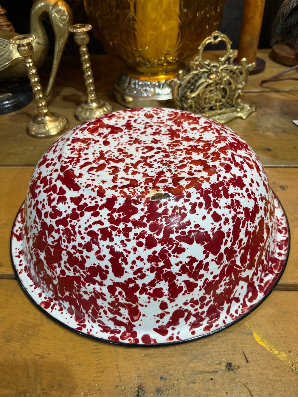 Super fun red splatter enamelware bowl. VINTAGE. Perfect for counter to hold fruit or add a pop of color to your decor. Individual matching bowls may be available. See separate listing.